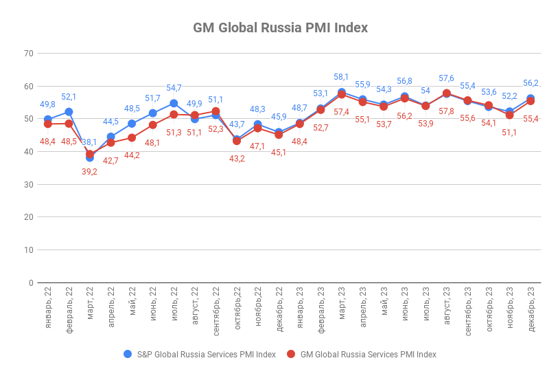 Декабрьское значение индекса деловой активности ГлобалМедиа PMI (GM Global Services Russia PMI Index) составило 55,4 п.п. против 51,1 п.п. в ноябре. Значение индекса деловой активности в сфере услуг от S&P Global (Global Russia Services PMI by the S&P Global) за аналогичный период выросло с 52,2 п.п. до 56,2 п.п.