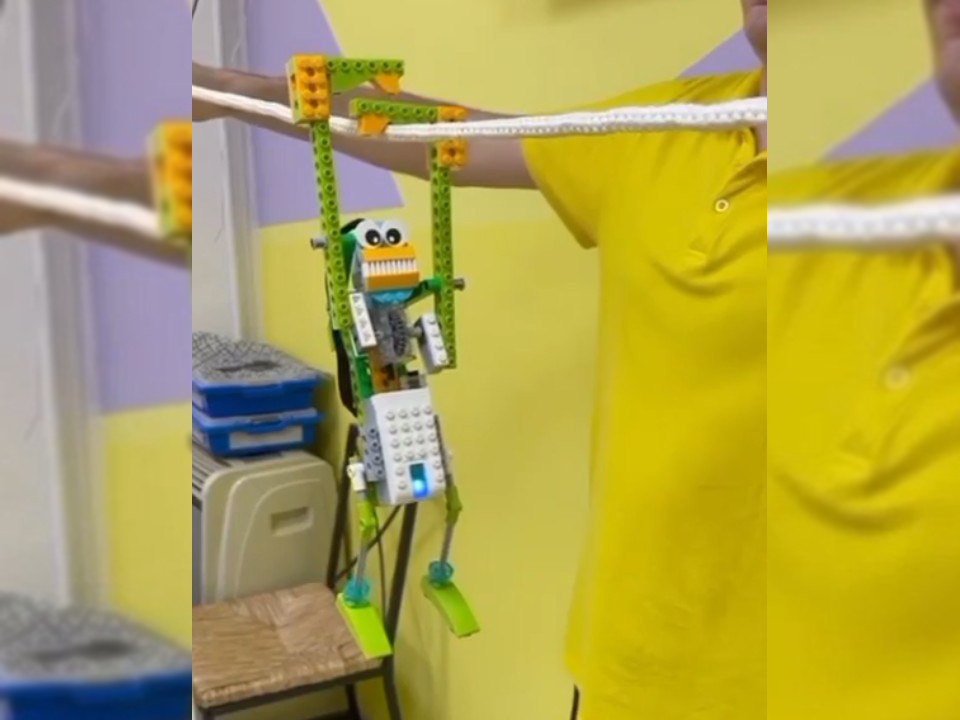 «Дети собрали робота из конструктора «Лего» и научили его на «руках» перемещаться по натянутой веревки. Конечно, двигается он с небольшой скоростью, но с испытанием справляется достойно», — рассказали организаторы кружка.