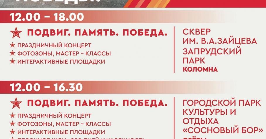 Самые массовые мероприятия состоятся в четверг. Яркую программу подготовили парки городского округа. А на площади Славы пройдут флешмобы «Знамя Победы» и «Вальс Победы».