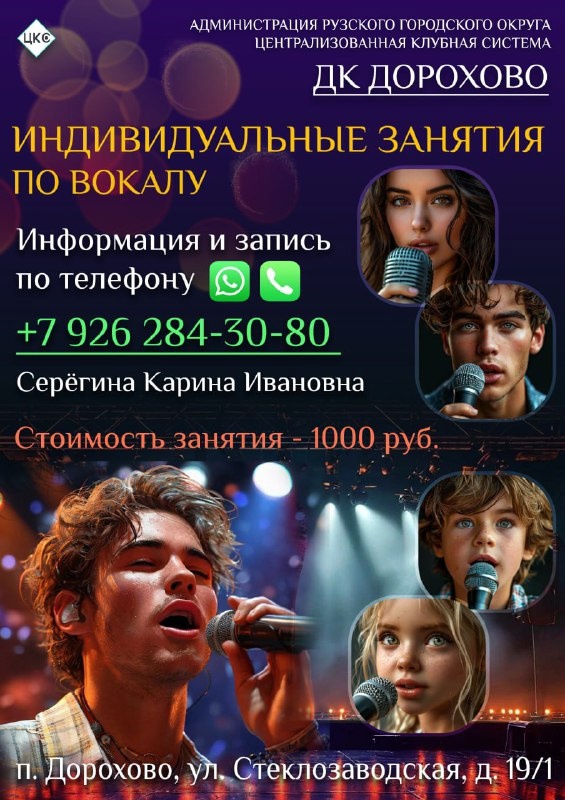 В Дороховском доме культуры будут проводиться индивидуальные занятия по вокалу. Приглашаются все, кто желает раскрыть свой талант. Вся информация по телефону +7 926 284-30-80 Карина Ивановна Серёгина.