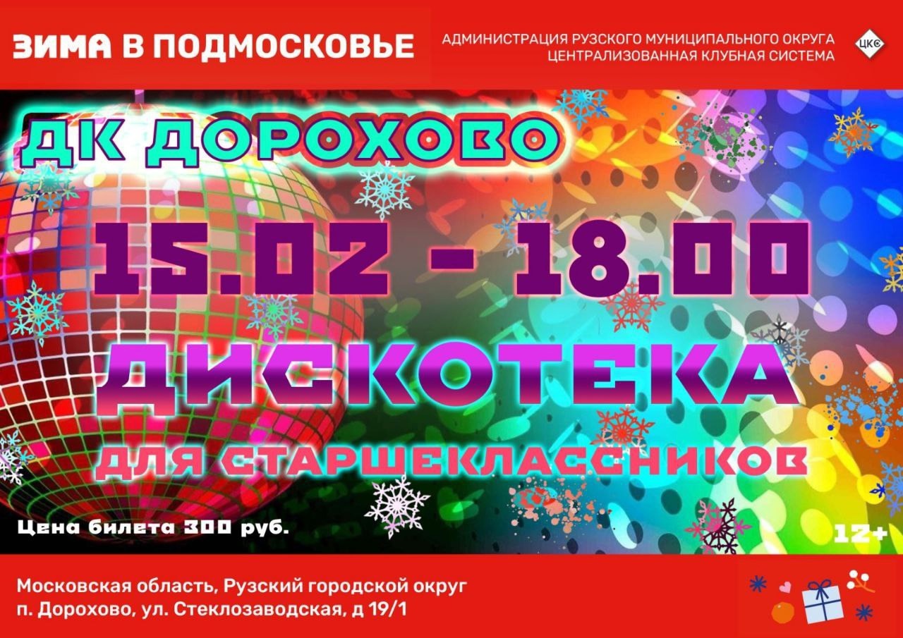 Дом культуры Дорохово приглашает на дискотеку для старшеклассников 15 февраля в 18.00.