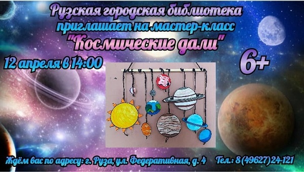 Рузская городская библиотека приглашает детей от 6 лет на мастер-класс «Космические дали». Он состоится 12 апреля в 14 часов.